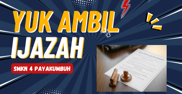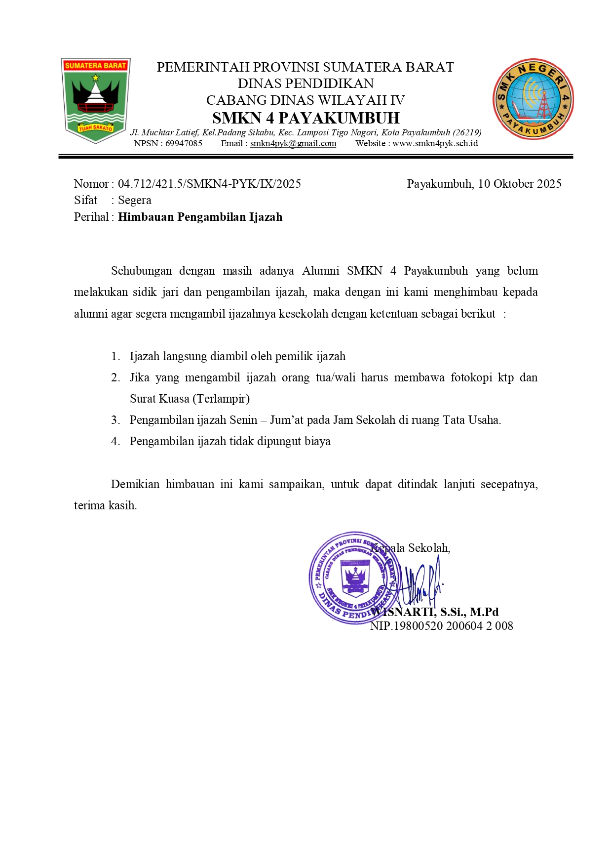 Diberitahukan kepada seluruh Alumni SMKN 4 Payakumbuh dari semua angkatan yang belum mengambil Ijazah agar dapat segera menyelesaikan administrasi dan mengambil dokumen penting tersebut. Ijazah merupakan dokumen otentik yang sangat penting sebagai bukti kelulusan dan kualifikasi pendidikan, diperlukan untuk melanjutkan studi ke perguruan tinggi, melamar pekerjaan, atau urusan legal lainnya. …
