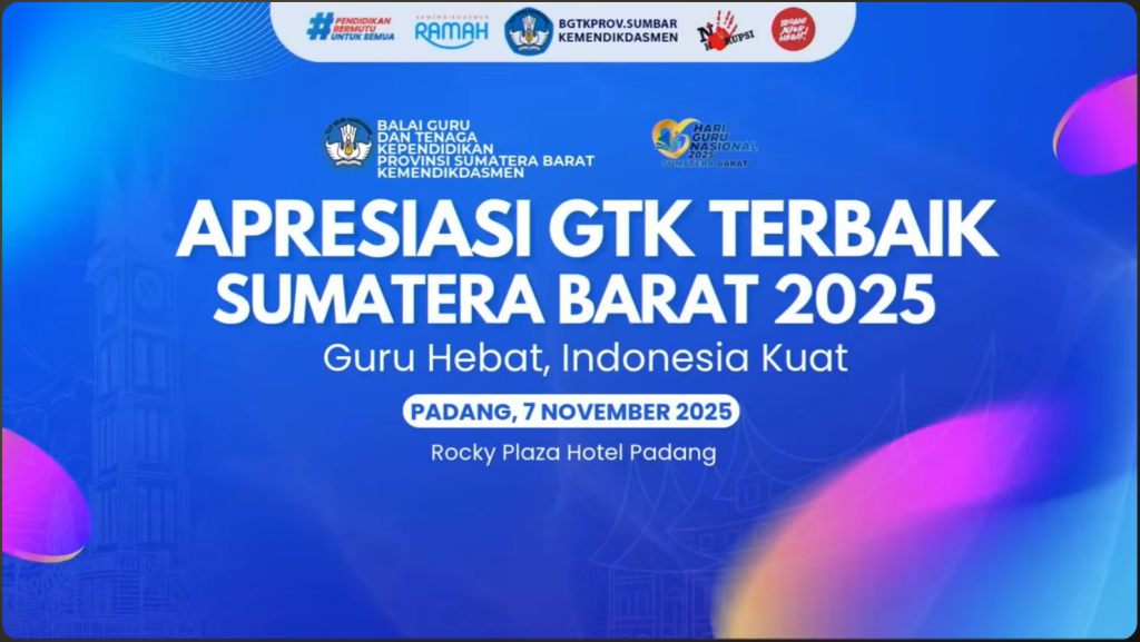 Malam puncak Apresiasi Guru dan Tenaga Kependidikan (GTK) 2025 tingkat Provinsi Sumatera Barat berlangsung meriah. Acara ini diselenggarakan oleh Balai Guru dan Tenaga Kependidikan (BGTK) Sumatera Barat di bawah kepemimpinan Hj. Sri Yulianti, M.Pd., dan PIC Bu Irawati, M.Pd. Kegiatan puncak tersebut digelar di Rocky Plaza Hotel, Padang, pada Jumat (7/11/2025). Mengusung tema “Guru Hebat, Indonesia Kuat,” ajang inisiatif BGTK Sumbar ini menjadi wadah apresiasi bagi guru dan tenaga kependidikan inovatif yang berdedikasi tinggi dalam meningkatkan mutu pendidikan.Acara puncak dihadiri oleh Direktorat Jenderal GTK Kemendikbudristek, yaitu Putra Asga Elevri, S.Si.,M.Si., serta para Kepala Dinas Pendidikan dari 19 kabupaten/kota se-Sumatera Barat. Ajang tersebut merupakan akhir dari proses seleksi berjenjang yang dimulai dari tingkat kabupaten/kota hingga provinsi. Setiap kategori lomba telah melalui seleksi ketat, dan pada malam final ini diundang 3 besar finalis tiap kategori untuk mempresentasikan karya terbaik mereka. Presentasi final menentukan juara provinsi yang selanjutnya akan mewakili Sumbar dalam Apresiasi GTK tingkat nasional pada perayaan Hari Guru di Jakarta. Sorak sorai dan tepuk tangan meramaikan ballroom ketika pemenang setiap kategori diumumkan. Kebanggaan terasa khususnya bagi SMKN 4 Payakumbuh yang berhasil menyabet dua penghargaan bergengsi di tingkat provinsi tersebut.