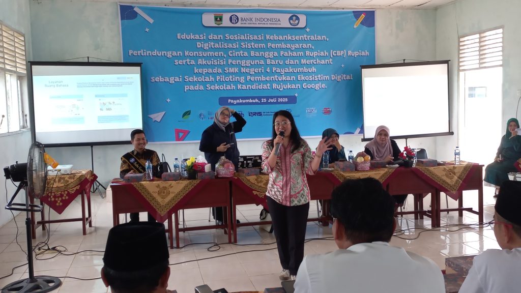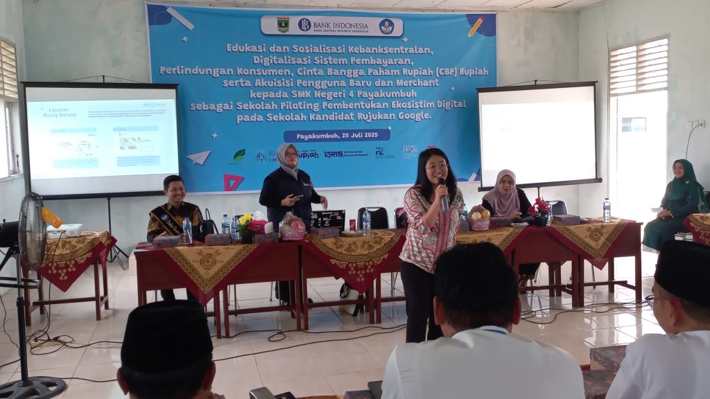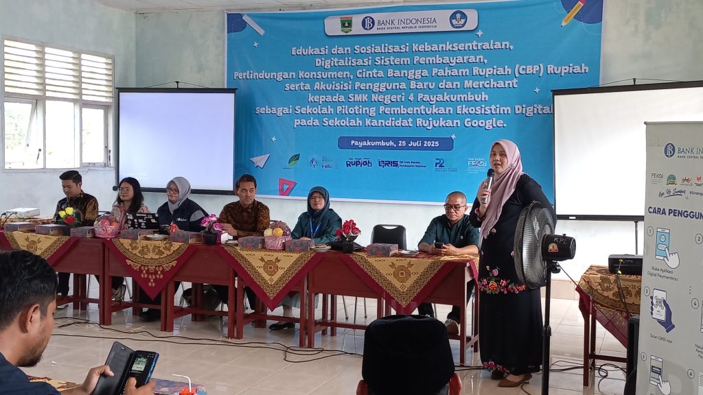 Payakumbuh, 25 Juli 2025 — SMKN 4 Payakumbuh mencatat sejarah baru dengan menjadi sekolah percontohan (piloting) dalam program Digitalisasi Sistem Pembayaran dan penguatan edukasi Kebanksentralan yang digelar dalam bentuk acara sosialisasi dan edukasi bertajuk “Edukasi dan Sosialisasi Kebanksentralan, Digitalisasi Sistem Pembayaran, Perlindungan Konsumen serta Cinta, Bangga, Paham Rupiah (CBP)”. Kegiatan ini juga menjadi bagian dari inisiasi pembentukan sistem digitalisasi pada kandidat Sekolah Rujukan Google.